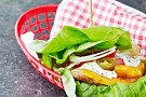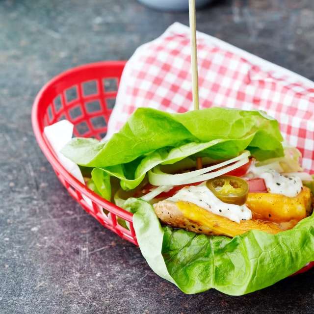 ■Lägg ett salladsblad på varje tallrik. Lägg på en kycklingburgare, en klick aioli och toppa med skivor av tomat och lök. Avsluta med att lägga på ett till salladsblad. Voilà en riktigt god burgare redo att ätas med händerna!