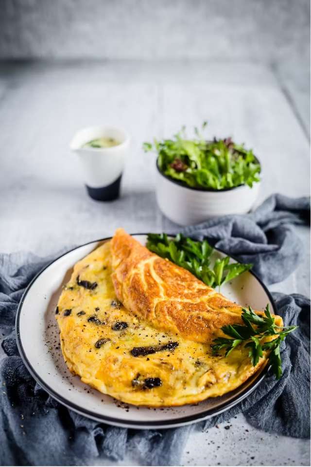 *Använd en stekspade och lätta lite runt kanten på omeletten. När undersidan börjar bli gyllenbrun är det dags att vika omeletten och låta den glida över på en tallrik.