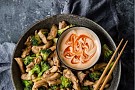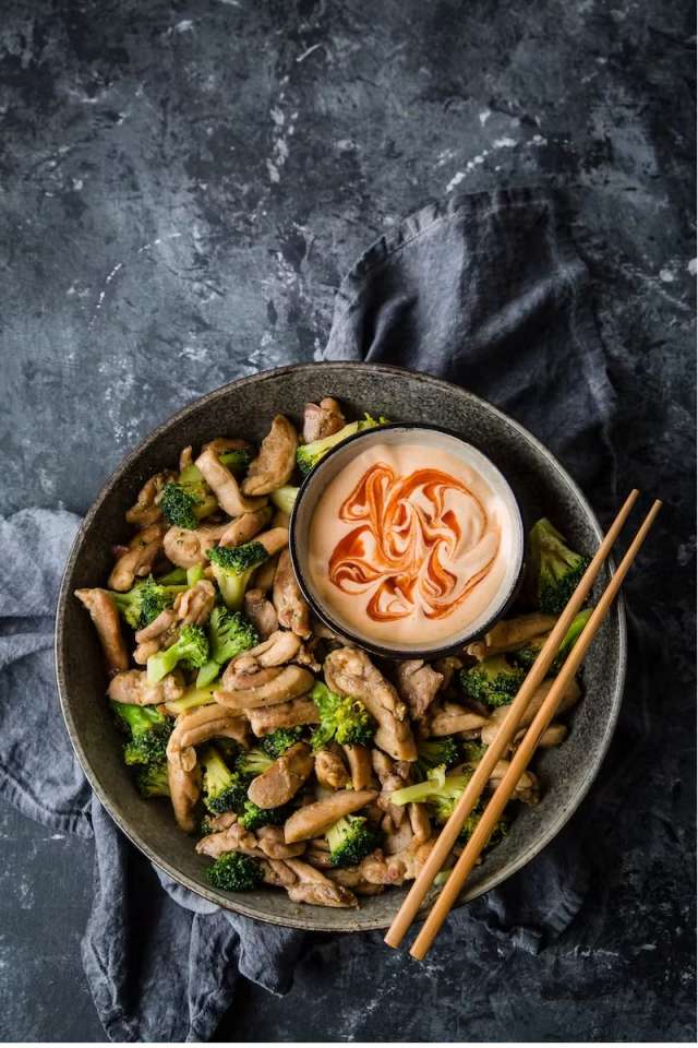 *Lägg i broccoli och soja. Rör ihop och stek i några minuter. Broccolin ska fortfarande vara krispig. Häll upp i portionsskålar och servera tillsammans med majonnäsen på sidan om.