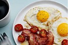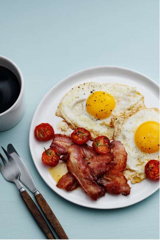 *Lyft bort baconskivorna och håll varmt medan du steker äggen och tomaterna i det överblivna stekfettet.