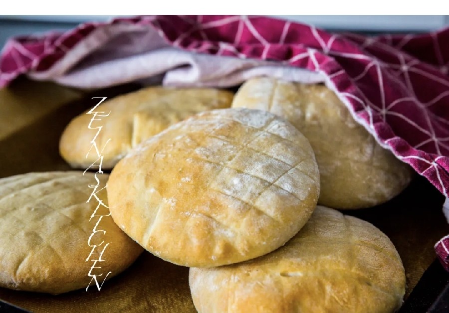 ■Låt vila under bakduk i ca 30 min. Ta en degboll och lägg på mjölat bord. Tryck varsamt ut bollen med fingrarna till ett runt bröd som är ca 0,5 cm tjockt och ca 15 cm stor i omkretsen. Lägg på en plåt med bakplåtspapper. Gör ett rutat mönster på brödets ovansida med en kniv.