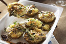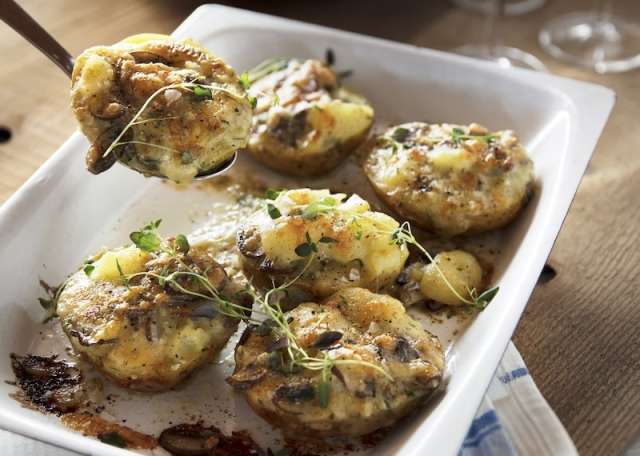 6. Lägg de fyllda potatishalvorna i en eldfast form och gratinera i ugnen, 225°, tills de får fin färg, ca 10 minuter. Dekorera med färsk timjan och servera med en sallad eller en grillad köttbit.