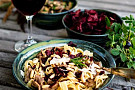 10. Servera direkt när pastan är klar! Lägg upp pastan i halvdjupa skålar och skeda över den krämiga lövbiffssåsen. Toppa med den vitlöksstekta svampen, nyriven parmesan, rostade pinjenötter.