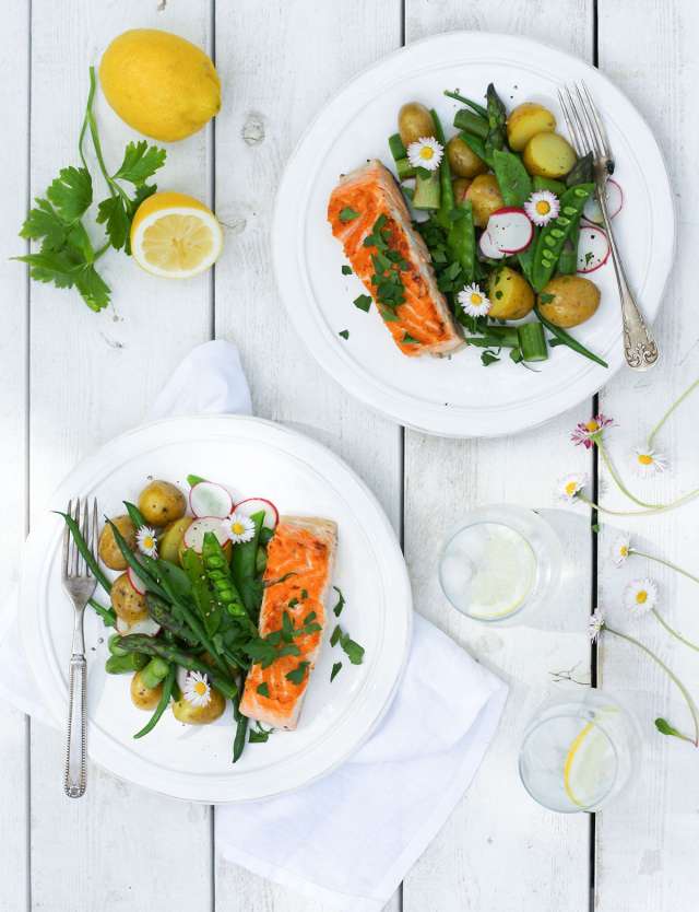 Stekt lax med färskpotatissallad och cashewnötsdressing