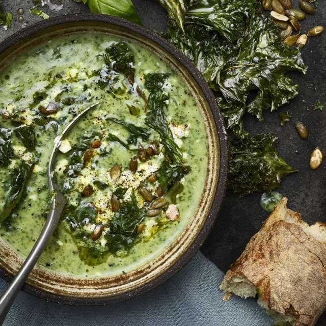2. Låt sjuda tills potatisen är mjuk. Lägg i basilikan (spara ev några blad till garnering) och mixa soppan slät. Smaka av med salt och svartpeppar. Toppa soppan med pumpakärnor och smulad chèvre. Garnera ev med basilikablad.