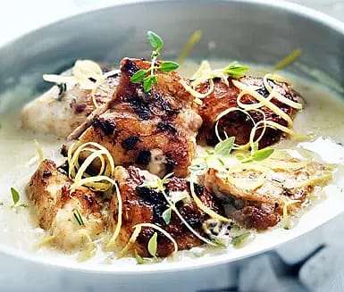 Blanda örtkryddor med rivet citronskal från hälften av citronen, skalad hackad vitlök, salt och peppar. Vik ut kycklinglårfiléerna och fördela kryddblandningen i dem. Rulla ihop kycklinglårfiléerna och bryn dem i matfettet i en stekpanna.