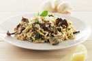 2. Tillsätt svampen och låt den steka med några minuter. Häll på vinet och låt det koka in lite, rör ner riset.