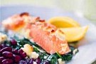 1. Sätt ugnen på 200 grader. Ta fram en rymlig ugnssäker form och häll olivolja i botten. Skölj spenaten och ta bort de grövsta stjälkarna. Koka upp vatten i en stor kastrull och lägg i spenaten. Låt den ligga i max 1/2 minut. Ta upp den och skölj i ett durkslag med iskallt vatten. Låt spenaten rinna av och lägg den i formen. Lägg laxen ovanpå spenaten. Strö over salt och lite vitpeppar.