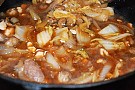 2. Häll ner kött och grönsaker i kastrullen. Koka ihop på medelstark värme tills köttet är klart.