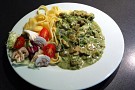 5. Strimla 90g soltorkade tomater. Tillsätt tomatstrimlorna och bladspenaten. Pudra över 1msk vetemjöl. Häll på 3dl mjölk och 1dl grädde. Låt allt koka ihop under omkörning några minuter.