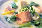 4. Tärna fisken och lägg i den. Använder du fryst fisk behöver den bara vara halvtinad när du lägger i den. Låt allt koka upp igen och sjud sedan cirka 4–5 minuter tills fisken är genomkokt men inte trasig.
