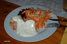 Gör skåror i falukorven - dock inte ända ner. Lägg i äppleklyftorna o löken i skårorna. Bred över senap o ketchup o strö över lite ost för gratineringens skull o in i mitten av ugnen på 200 graders värme i 30 minuter. Under tiden middagen gratineras förbereds salladen på vitkål o morötter. Råriv eller strimlas i maskin - vilket som passar er bäst. Dutta gärna på lite vinäger o olja i salladen för smakens skull.