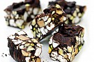1. Täck en mindre form (ca 20 x 12 cm) med plastfolie.2. Grovhacka nötterna. Tärna fudgen smÃ¥tt. Blanda nötter, fudge och marshmallows i en skÃ¥l. 3. Smält chokladen i mikro eller över ÂvattenÂbad. 4. Häll den smälta chokladen över nötblandningen, rör om sÃ¥ att allt täcks. Häll blandningen i formen, packa tätt. Ställ att stelna i kylen ca 1 timme. 5. Stjälp upp kakan och dela den i mindre bitar.