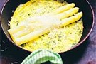 3. Grädda 8 tunna crêpes av smeten. Lägg 3 sparrisar på varje crêpe, riv parmesan över och rulla ihop crêpsen. Låt knopparna titta fram.
