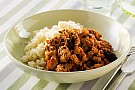 1. Hetta upp olja i en stekpanna. Lägg i färsen och finfördela den. Tillsätt spiskummin, salt och svartpeppar och fräs ca 3 min.  Skala och finhacka lök och vitlök. Strimla katrinplommonen. Blanda ner lök, vitlök och katrinplommon. Stek ytterligare ca 2 min. Rör om ofta.2. Blanda ner ajvar och vatten. Låt alltsammans puttra ca 10 min. Servera med couscous. Ca 500 kcal per portion, 16 g fett, 27 g protein, 57 g kolhydrater