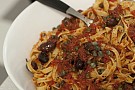 Se till att vitlöken inte blir bränd! 3. Tillsätt tomater, kapris och oliver. Låt småkoka under lock ca 15 min. Krydda med 1 1/2 tsk salt och 2 krm peppar.4. Koka pastan enligt anvisningen på förpacknigen. Häll av och blanda med tomatsåsen. Servera genast.