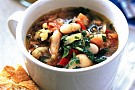 1. Skala och hacka löken. Dela, kärna ur och strimla paprikan. Skölj och riv zucchinin grovt. Tärna korven.2. Fräs löken mjuk i oljan 3–5 min. Tillsätt korven, fräs ytterligare ca 3 min. Tillsätt paprika, zucchini och krydda. Smula ner buljongtärningen och fräs under omrörning 2–3 min. Späd med ca 2/3 av vattnet och koka upp soppan under omrörning. 3. Tillsätt skalad och fintärnad potatis. Koka soppan på svag värme under lock ca 15 min. Späd med resten av vattnet till önskad konsistens. Spola bönorna och låt dem rinna av i ett durkslag. Häll dem i soppan. Koka upp. 4. Smaka av med salt och peppar. Garnera med persilja.