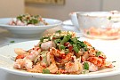 2. Skiva zucchinin och dela ner paprikan i klyftor. Salta och peppra. Grilla de mjuka i grilljärn. Blanda grönsakerna med glasnudlarna och sardellvinaigretten. Rör ner räkorna och ruccolan, lägg upp.