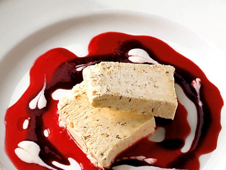 3. Såser: Kör hallonen, 2 msk florsocker och 1 msk pressad citronsaft i matberedare eller mixer till puré. Sila moset genom trådsil. Gör likadant med björnbären. Lägg upp skivor av parfait och servera med de två såserna.