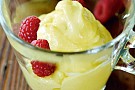 1. Skölj limen noga i ljummet vatten. Riv skalet och pressa ut saften.2. Lägg alla ingredienser i en matberedare och mixa till en jämn, krämig konsistens. 3. Fördela fluffet i små glas. Garnera med hallon. Servera genast.