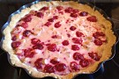 Blanda degen (smör, mjöl, bakpulver, socker) och platta ut i form, 10 min 175 grader, frusna bär mycket mer än receptet (ta ca 3-4), fylln; CF, bär, socker o vaniljsocker! Mindre pajdeg än receptet, gräddas 20 min 175 grader