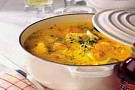 4. Lägg i fisken, koka upp och sjud tills fisken är klar. Tillsätt räkorna.