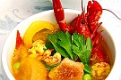 3. Hetta upp oljan i en gryta som rymmer hela rätten. Häll i saffran, skivad vitlök och chilipeppar. Rör om och tillsätt paprika. Låt fräsa några minuter. Häll på buljongen. Låt sjuda i 13-14 minuter. Lägg i fänkål, selleri och tomat. Låt koka i ytterligare 3-4 minuter. Lägg i ärter. Koka upp. Dra från värmen och lägg i kräftstjärtar och klor. Krydda med salt och peppar.