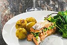 1 Skölj och riv zucchinin grovt. Blanda det rivna med salt i ett durkslag och låt det stå ca 30 min så att vattnet dras ur. Pressa lätt för att få ut vattnet. Hetta upp olja i en stekpanna och fräs zucchinin ca 1 minut. Strimla salladslöken, blanda ner den och stek ytterligare ca 1 minut. Blanda ner örterna och ställ åt sidan.2 Lägg upp laxsidan på en skärbräda och dela den på längden precis där den tjockare delen blir tunn. Det blir en bredare tjock del och en smalare tunn som kommer att bli översidan.3 Lägg ut 4–5 långa steksnören, ca 30 cm långa, på tvären i en ugnssäker form och lägg den tjocka laxsidan ovanpå med köttsidan upp. Strö salt på laxen och även på köttsidan av den andra laxdelen.4 Sätt ugnen på 200°. Skölj och skrapa eller borsta potatisen och koka den ca 5 min. Häll bort vattnet och blanda potatisarna med olja. Bred ut zucchini- och örtblandningen på laxen och lägg den tunnare delen över med skinnsidan upp. Knyt om snörena.5 Lägg den förkokta potatisen bredvid laxen i samma form och strö på salt. Stek mitt i ugnen ca 20 min beroende på laxens tjocklek eller tills innertemperaturen är 58°. Rör om i potatisen någon gång under tiden.6 Rör samman samtliga ingredienser till såsen. Låt den stå kallt. Servera laxen varm eller ljummen med den kalla såsen och en blandad grönsallad.