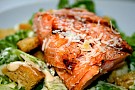 1. Skölj salladen i kallt vatten och låt den torka på papper i kyl. 2. Mixa äggulor med citronjuice, fransk senap och vitlök. 3. Tillsätt olja i en tunn stråle så att dressingen tjocknar. 4. Späd ut med lite vatten så att dressingen blir smidig att jobba med. 5. Smaksätt dressingen med parmesanost, sardeller, salt och peppar. 6. Olja laxen lätt och grilla den på ett rent och hett grillgaller i ca 2 minuter på varje sida. 7. Tillaga klart laxen i 160C i ca 7 minuter eller till en innertemperatur på 48C. 8. Vänd runt salladen i rikligt med dressing innan servering. 9. Servera salladen med laxen och toppa med krutonger.