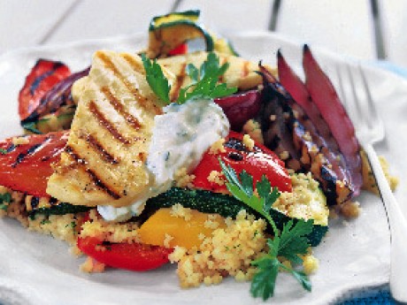 3. Skölj persiljan och plocka av bladen. Blanda de grillade grönsakerna med hela persiljeblad och couscous.