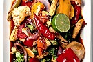 3. Lägg alla grönsakerna i woken och häll över woksåsen. Låt allt bli hett och servera genast.