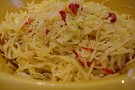 Vispa ihop ingredienserna till dressingen och blanda ner vitkål och paprika i den. Blanda väl och lägg den ännu ljumma salladen i en plastskål med tättslutande lock och låt den kallna.