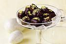5. Finhacka chokladen. Smält 2/3 i mikrovågsugn eller över vattenbad. Tillsätt resten av chokladen och rör tills allt smält. Doppa ovansida och kanter av godiset i chokladen. Låt rinna av och ställ på en plåt med bakplåtspapper. Strö över lite gul kokos och låt stå svalt tills chokladen stelnat.