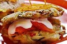 4. Lägg en plätt med några skivor rökt lax och en klick gräddfil på. Lägg sedan en plätt till ovanpå och garnera med lite apelsinrasp.