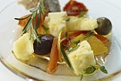 6 Lägg paprika, ost, tomater och oliver i en eller flera skålar och slå marinaden över. Låt mogna ett par timmar innan servering eller gärna över natten.