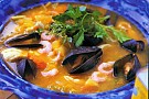 5. Ta upp den kokta fisken med hålslev, fördela i rymliga sopptallrikar. Lägg i några skalade räkor eller kokta havskräftor. Sist några nykokta musslor.