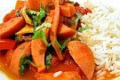 3. Bryn falukorven i lite smör och blanda ner den i grytan. Låt grytan koka upp och smaka av med salt och peppar. Strö lite färsk koriander över och servera med nykokt ris.