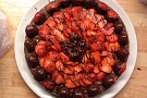 9. Halvera tillräckligt med jordgubbar att det räcker runt hela kakan och doppa dem i chokladen. Placera ut dem runt kakan(se bild)